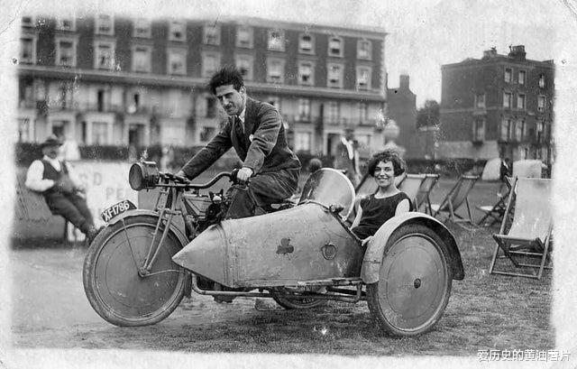 1920年代,在英国马盖特的海滩上,一对夫妇骑着摩托车。