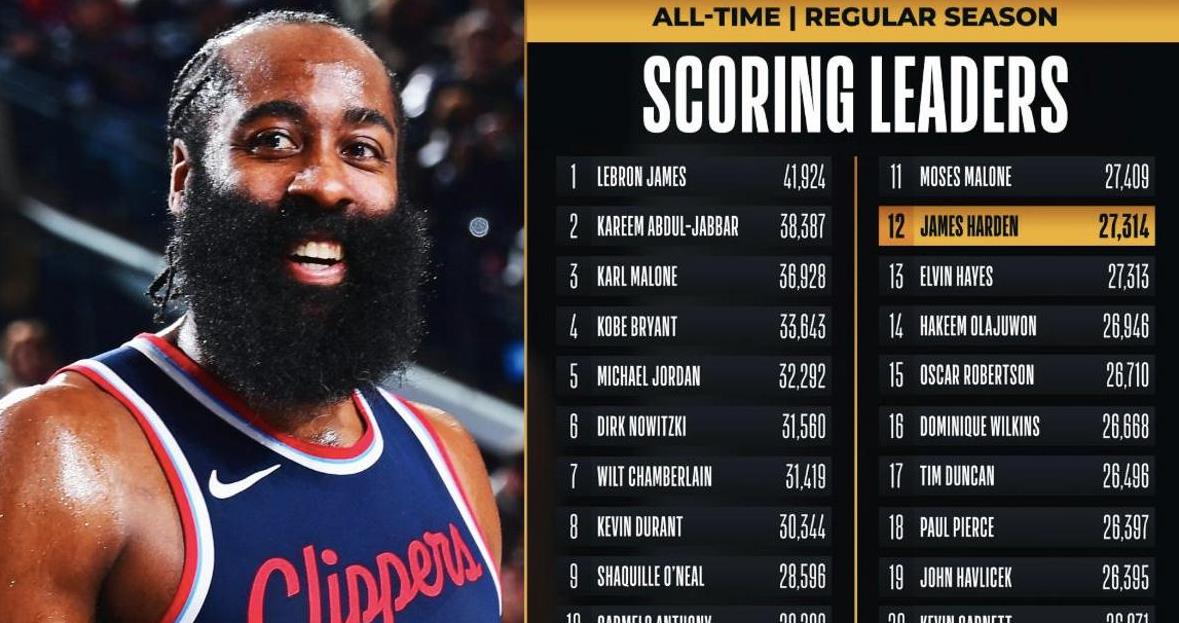 "登哥今晚是来改写历史的!"当终场哨声响起时,亚特兰大观众席上此起彼伏的叹息声,见证着哈登职业生涯的又一个高光时刻。这位33岁的控卫在对阵老鹰的比赛中,用25分8篮板7助攻的全能表现,不仅率队完成17分逆转,更在第三节单节独砍13分,以24299分超越"酋长"海耶斯,正式跻身NBA历史得分榜第12位。