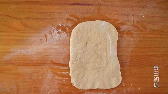 静置时间到后,将面团光滑面朝上放在桌面,上下擀压成椭圆形。翻转光滑面朝下,将面团擀压成长方形,分别从左右两边折入三分之一,再擀压至长度为30cm左右,压薄底边,卷起面团,收口朝下放置。