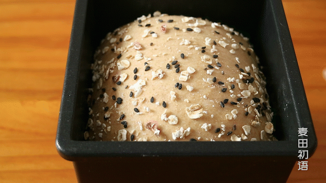往面团表面上喷洒水雾,然后沾上混合谷物,侧面和底部也要沾上谷物。放入吐司盒中,这里你也可以换成1个450克吐司盒。送入发酵箱进行二次发酵,设置温度为35度,湿度为85%,如果没有发酵箱则用烤箱加热水的方式发酵。