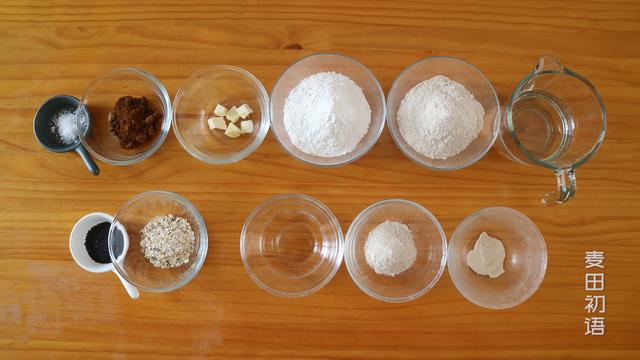 主面团:全麦粉130克,高筋面粉150克,鲜酵母7克,食盐4克,红糖20克,水175克,无盐黄油10克
