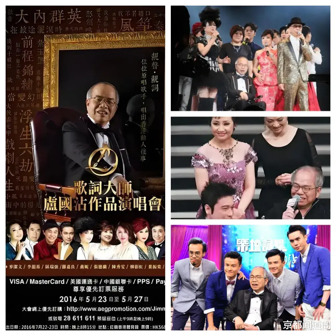 他上一次公开露面,还是2016年,香港TVB致敬特辑《乐坛词圣卢国沾》和《歌词大师卢国沾作品红磡演唱会》,众星云集,岁月如歌,坐在轮椅上的他,身边妻女相伴,五味杂陈,感慨万千。这些年,他几乎被人忘记,一直过着深居简出的生活。