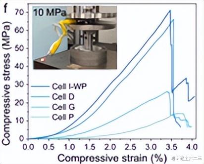 机械稳定性:SiOC基板的结构连续性和周期性使电池具有各向同性的机械行为,PVA 水凝胶能有效保留碎片,减少二次损伤。I-WP结构的SiOC具有更均匀的应力分布和增强的抗压强度,其配置不仅减轻了重量、增加了表面积,还优化了机械性能。