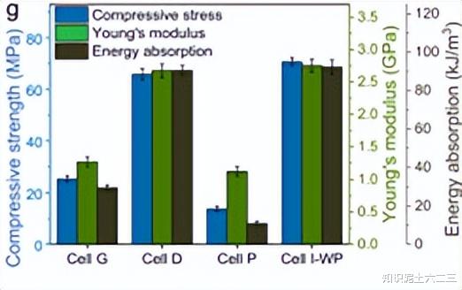 电池在压力加载下表现出刚性机械行为,G、D、P和I - WP结构的电池的抗压应力分别为25.36 ±1.27、65.72±2.28、14.75±1.06和70.61±1.53 MPa,相应的能量吸收容量分别为29.49± 1.59、90.40±2.65、10.76±1.14和92.15±3.78 kJ /m³。