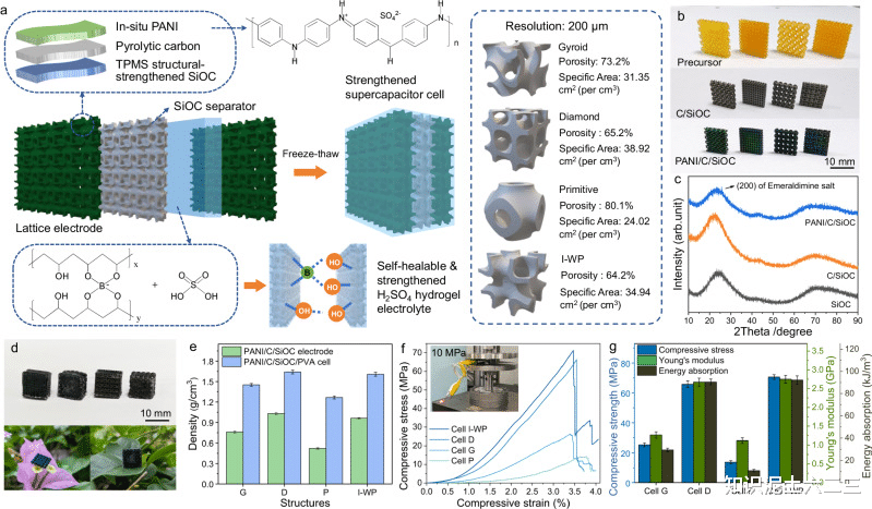 制备过程:通过3D打印将SiOC基板制成三重周期最小表面(TPMS)结构,如螺旋(G)、金刚石(D)、原始(P)和I -包裹封装(I-WP),然后经过烧结、涂覆热解碳和原位聚合PANI等步骤,制备出PANI/C/SiOC电极。