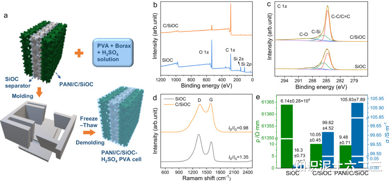 结构加强:多孔TPMS结构的电流收集器促进了PVA溶液向内部空间的渗透,XPS和拉曼分析表明C/SiOC表面存在碳层,其导电性得到增强,电阻率和电导率分别为10.05± 0.45Ω和99.62±4.52 S /m,而原始SiOC的电阻率和电导率分别为6.14±0.28×10⁴ Ω・mm和 16.3±0.73×10⁻³S /m。