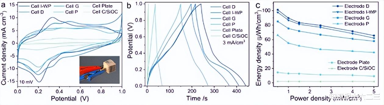 电化学性能:不同TPMS结构的电极在循环伏安法(CV)分析中表现出相似的氧化还原峰值,CV曲线的一致性表明电极几何形状对电化学行为影响较小,电池在不同扫描速率下具有高可逆性和稳定性。恒电流充放电(GCD)曲线显示,不同结构的电极具有相似的等腰三角形形状,表明充电和放电过程的可逆性。D和I-WP结构的电极具有更明显的充电和放电平台,这是由于它们具有更高的比表面积,可以形成更大的活性层,从而促进更充分的氧化还原过程,最大限度地提高活性层的电化学性能。例如,G、D、P和I - WP 结构电极的比电容分别为 516.99、601.06、369.45和585.51 mF /cm³,而 I - WP 结构电极在0.5 mW /cm³的功率密度下实现了97.63μWh /cm³的能量密度,在5 mW /cm³的功率密度下仍保持 62.07μWh /cm³的能量密度。