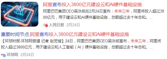 阿里CEO表示:未来三年将投入超3800亿元,建设云和AI硬件基础设施。