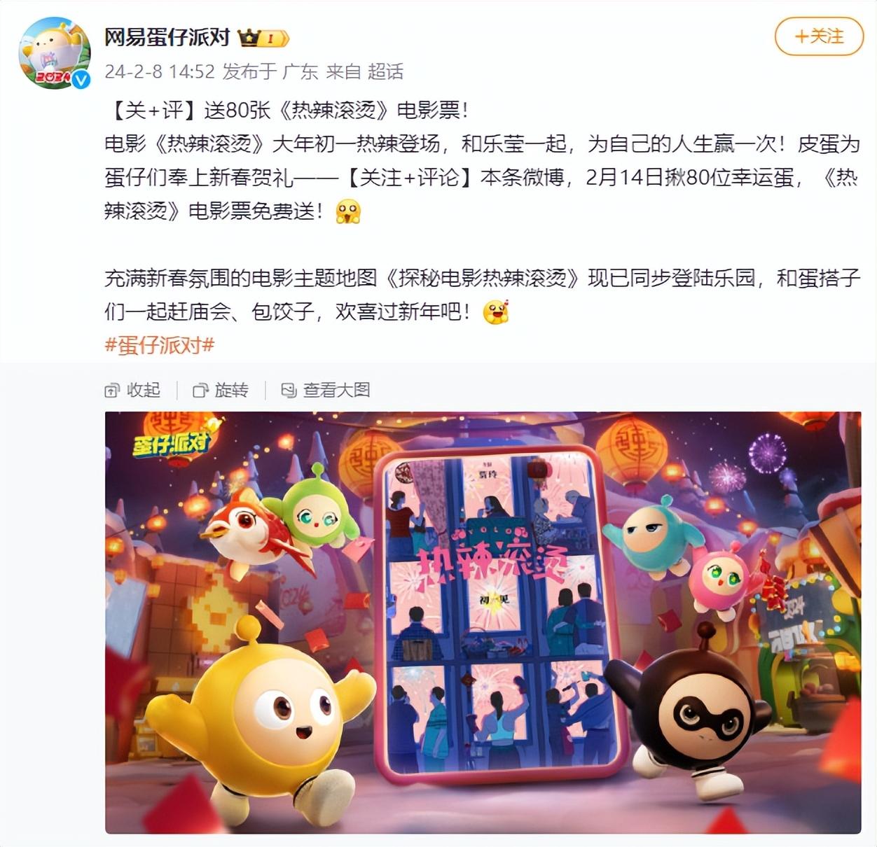 在这背景下,《蛋仔派对》联合贾玲执导、主演的《热辣滚烫》为玩家们送上一份惊喜。参与微博活动,通过简单的【关注+评论】方式,每个人都有机会赢取免费的《热辣滚烫》电影票,这无疑增添了更多人参与到新春庆祝活动中的热情与期待。活动将于情人节开奖,共有80位幸运儿可以获得免费观影的机会,特殊的日期特殊的福利更是给这份贺礼赋予了另一层特别的意义,寓意着在爱与被爱的氛围中,让更多人共享这份来自《热辣滚烫》的温情与热辣。