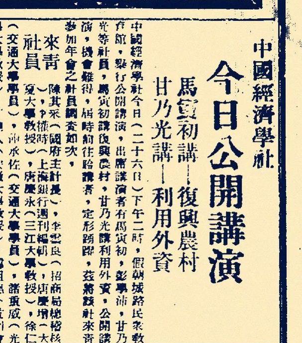 演讲公告到1935年有社员285人,集中了一批政界商界学界文化界有影响力的人物。“中国经济学社”每年都会选择一中国的第一流的城市举办年会,在马寅初担任会长的1927到1936年年间,年会分别在“上海、杭州、南京、无锡、宁波、杭州、青岛、长沙、广州、上海”举办。看到没有?在这些城市中,南京是当时国民的首都,上海是中国经济的中心,杭州、长沙、广州都是省会城市,宁波、青岛是中国的通商口岸。这其中,只有无锡县是一个小县城,但却被选为“中国经济学社”年会的承办地,与中国第一流的城市比肩。