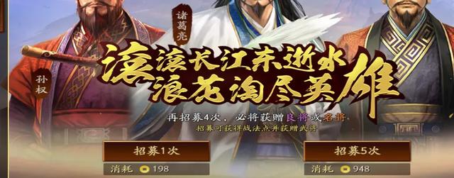 三谋五连抽价格是39元,相比三战的94.8元,确实【减氪】。同时发现个更有意思的对比,就是三谋会有明确的出橙提示,比如还有“5次必出名将或珍品战法(记住这是橙卡或橙色战法)”;三战的提示描述是“再招募5次必将获得良将(紫卡)或名将(橙卡)”。玩儿三战的大多数月卡玩家都是自己弄个抽卡记录,来预估自己的保底武将,哈哈,懂的都懂。三谋确实更直接。