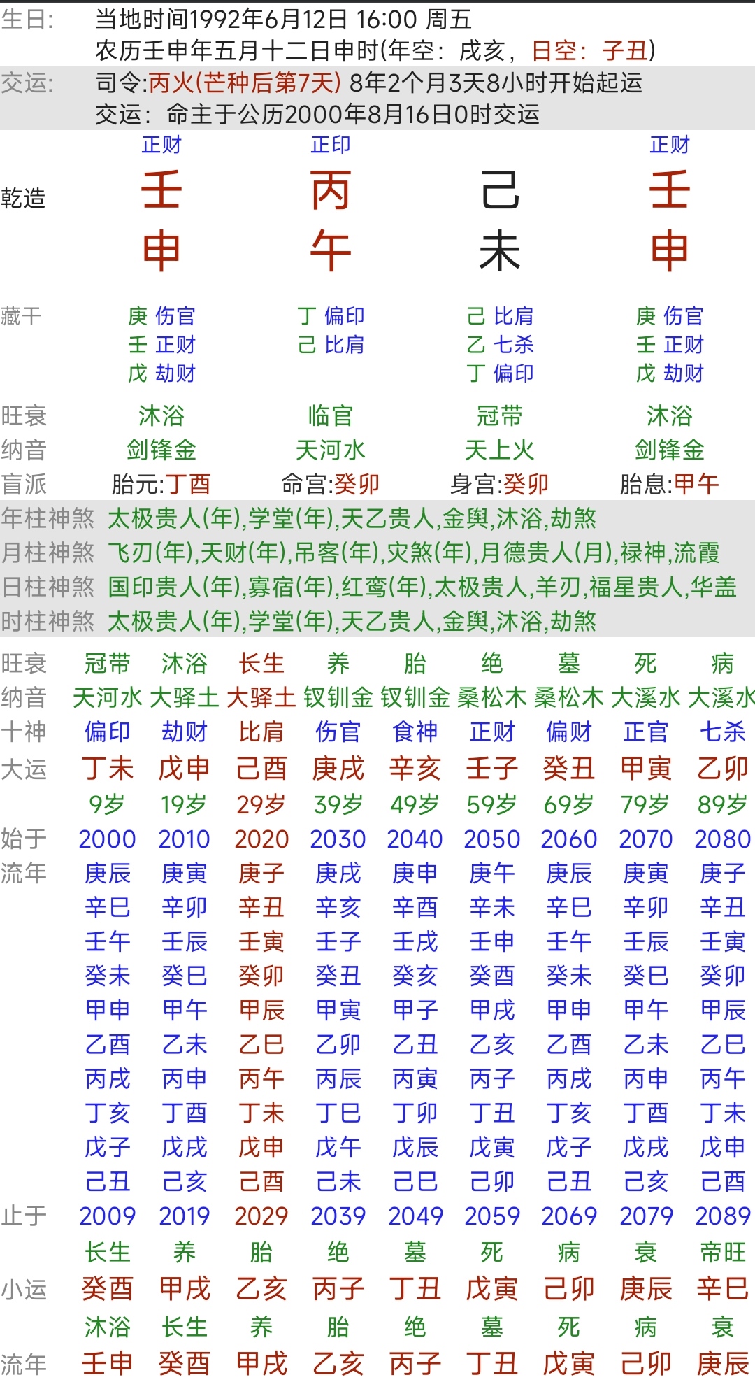 八字乾造:你生于壬申年、丙午月、己未日、壬申时(日空:子丑)8岁起运丁未;剑锋金命人,每十年逢立秋之后转运,现在走28岁到38岁的己酉大运中。