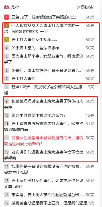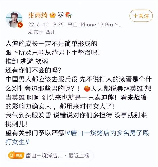 2022年6月10日凌晨,河北唐山某烧烤店发生一起寻衅滋事、暴力殴打他人事件,激起强烈公愤,各路明星流量也纷纷发文声援,已影响力而论张雨绮当排在前列: