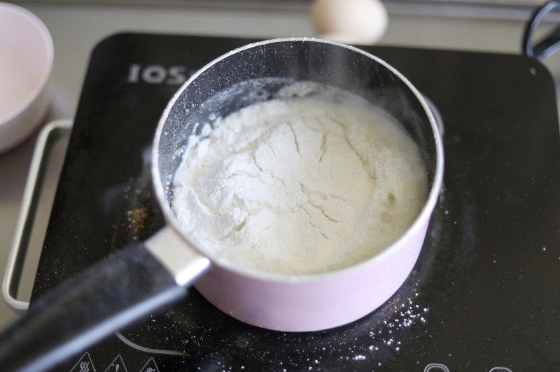 4. 取一小奶锅,倒牛奶,放砂糖,黄油,加热到黄油完全融化,牛奶沸腾关火。加入过筛的低粉,用硅胶刀搅拌,和液体彻底混合无面粉颗粒即可。
