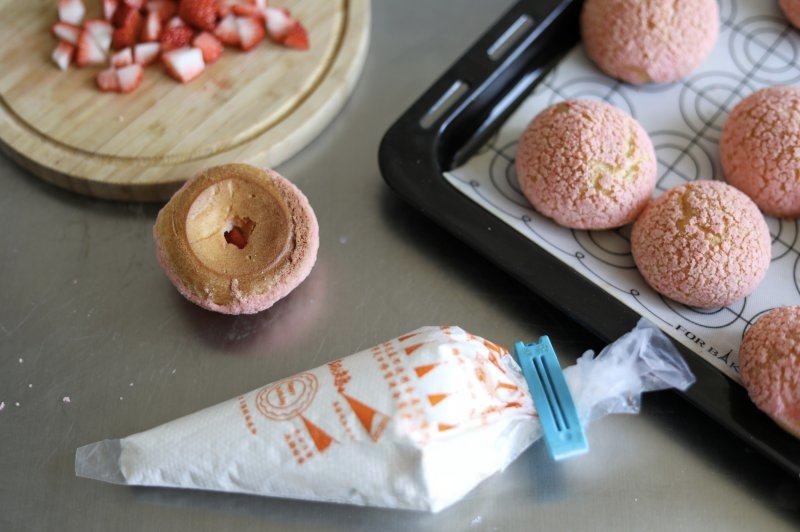 16. 把草莓颗粒通过小孔塞进泡芙里,可以多放一些,一半草莓一半奶油最标准,草莓可以缓解奶油的甜腻感。