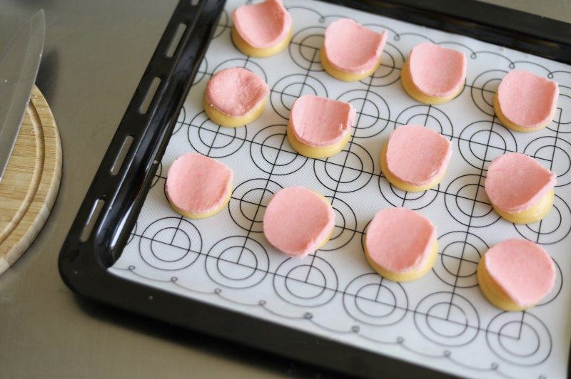 10.这时候取出冷藏室的酥皮,切成均匀厚度,盖在挤好的泡芙上。