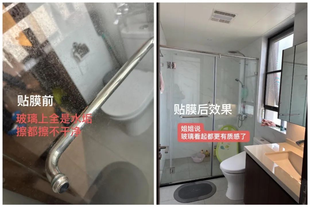 为了解决这个痛点,年轻人直接在玻璃隔断上贴膜,这样就可以“防爆”还耐脏。贴完防爆膜之后,玻璃的透光性也没有丝毫影响,也解决了水垢的问题。