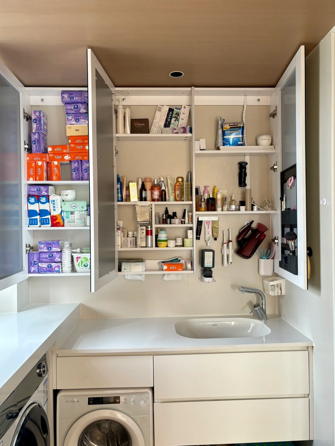 虽说卫生间零零散散的物品由镜柜来收纳,但是不免有些不人性的地方。就比如牙刷、吹风机、牙膏等等,还是要摆在外面,因为放在镜柜不仅放不下,而且使用起来拿取也不方便。