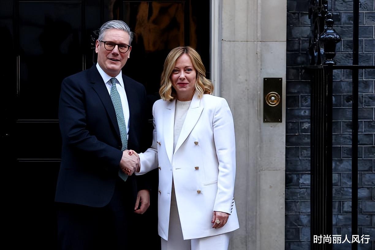 意大利美女总理获斯塔默热情吻面礼!梅洛尼一身白色套装,太惊艳