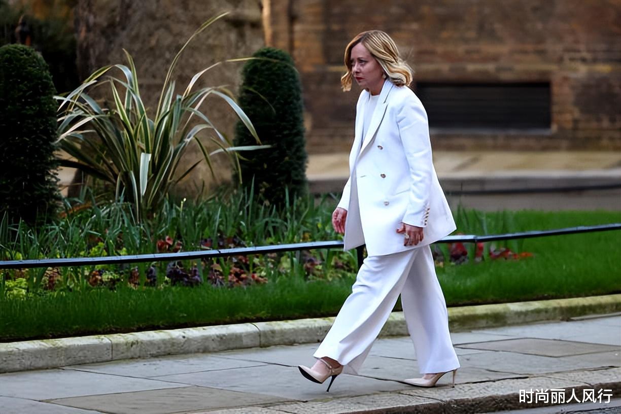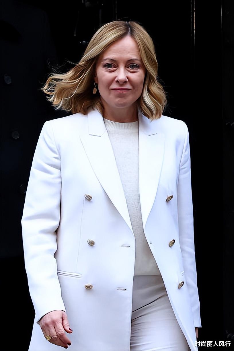 梅洛尼当天选择了一身干练又霸气的白色西服套装,和传统的职业装相比,意大利美女总理更喜欢oversize的风格。