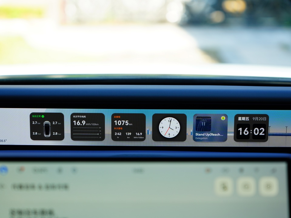 坐上驾驶席后,原本的仪表盘被一块远端的35.4英寸全景屏所取代,延伸的部分有些像一块加大版的dock栏,用来显示车辆的基本信息、能耗、日历等等;中央的15.6英寸中控屏则能够提供导航、音乐等高频使用的应用。