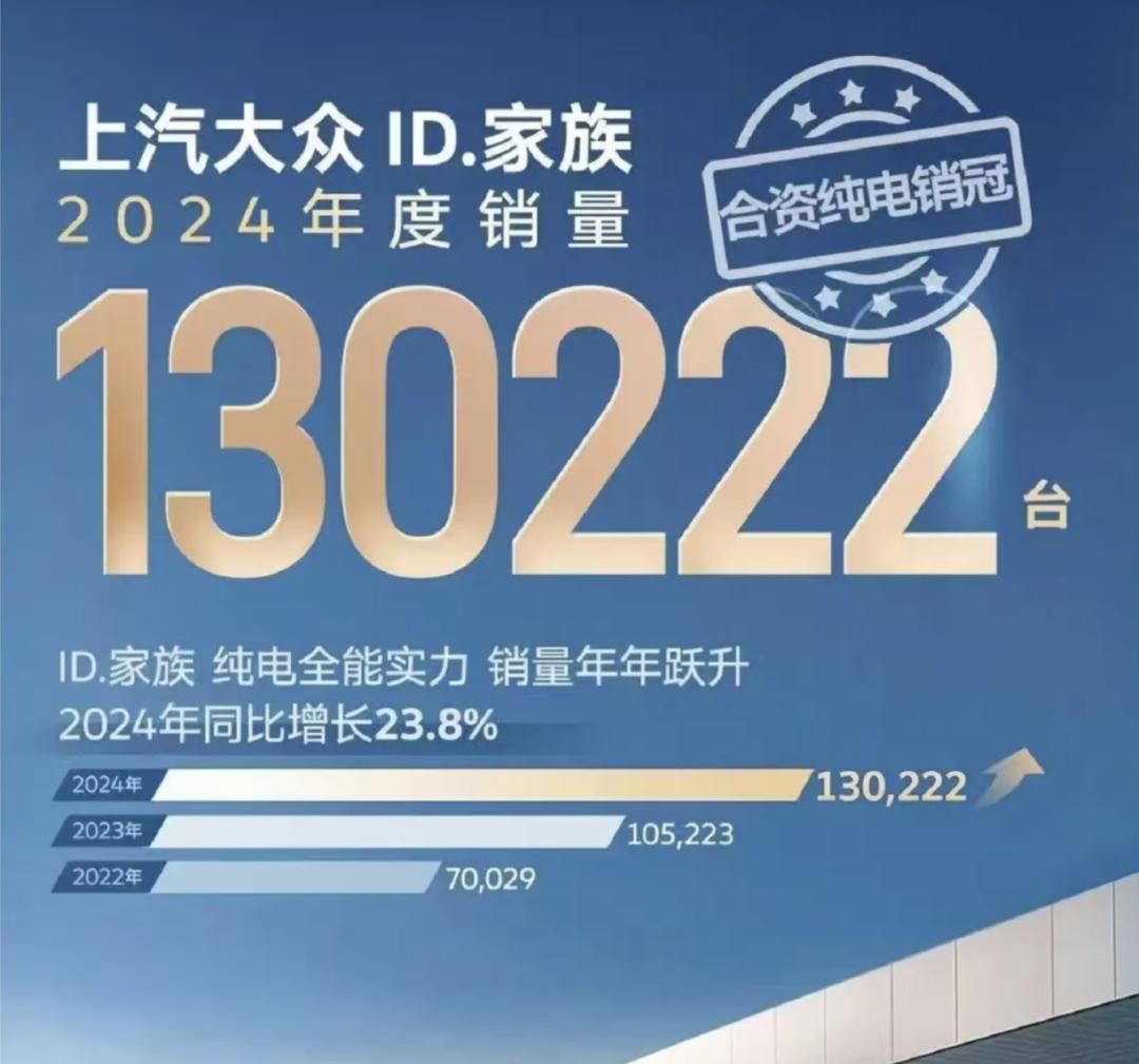比如上汽大众2024年销量突破120万台,ID.家族更是凭借全年热销130222辆,同比增长23.8%的成绩,拿下合资纯电销量王,为自己送上一份不错的40岁生日礼物。值得一提的是,截止2024年11月,ID.3 已经达成累计销量20万辆里程碑。