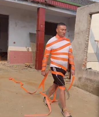 小莫哥一看,立马从自家拿了两条床单和窗帘披上,还在后面绑了个晾衣架,硬是摆出模特那种一脸冷漠的走姿,简直跟走秀现场没啥区别!