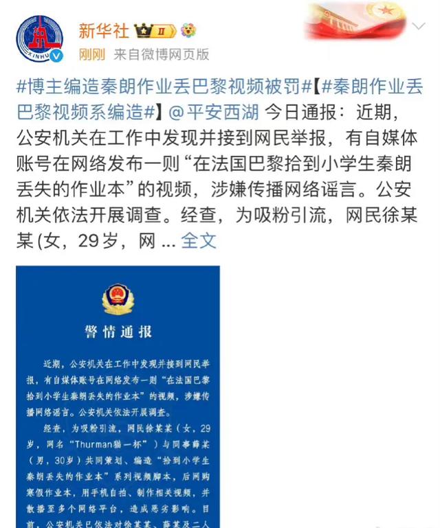 但这件事结没结束呢?没有,直到昨天,4月12日,警方发布情况通报:为“秦朗事件”是网红“Thurman猫一杯”与同事共同策划、编造“拾到小学生秦朗丢失的作业本”系列视频脚本,后网购寒假作业本,用手机自拍、制作相关视频,并散播至多个网络平台,造成恶劣影响。目前,公安机关已依法对猫一杯、前同事及二人所在公司作出行政处罚。