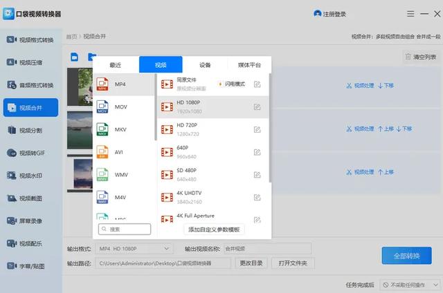 然后点击左下角的输出格式,软件提供多种视频输出类型,例如MP4、MOV、M4V等,还可以自定义输出的视频分辨率,4K、1080P、同原文件等,设置完成后点击全部转换
