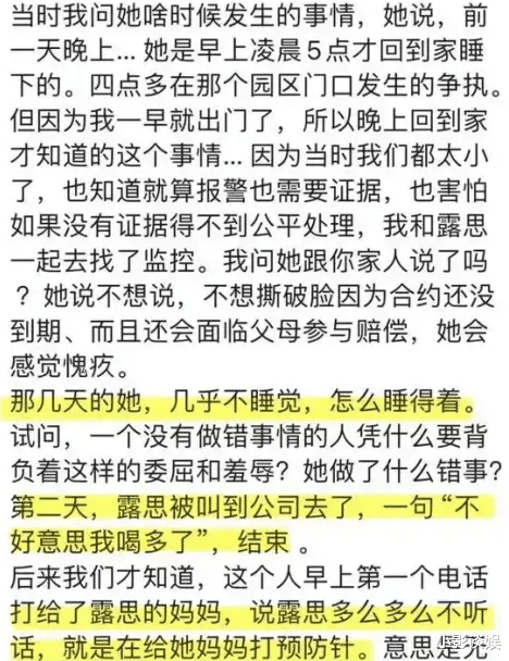 朋友赶到的时候,看到的只有被吓坏的赵露思,原本想帮她报警,却苦于没有证据,还有合约的限制,最后吃哑巴亏。可老板丝毫没认识到自己的错误,第二天用一句“喝多了”搪塞而过,在赵露思的父母面前还充当好人,声称所做的一切都是为了赵露思好。