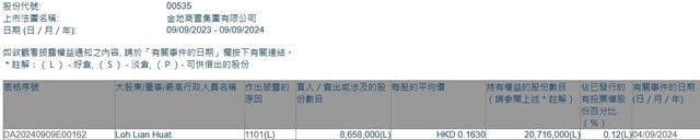智通财经APP获悉,据香港联交所最新数据显示,9月4日,非执行董事Loh Lian Huat增持金地商置(00535)865.8万股,每股作价0.163港元,总金额约为141.13万港元。增持后最新持股数目为2071.6万股,持股比例为0.12%。