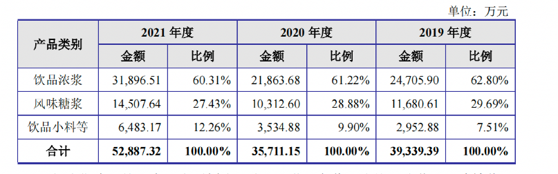 饮品浓浆收入为公司主营业务收入的主要来源,销售金额总体呈现快速增长的态势。2019 年至 2021 年,饮品浓浆收入分别为 2.47亿元、2.19亿元及 3.19亿元,占主营业务收入的比例分别为 62.80%、61.22%及 60.31%。此外,风味糖浆所占主营业务收入等比例相对稳定,饮品小料等收入销售金额持续增加。