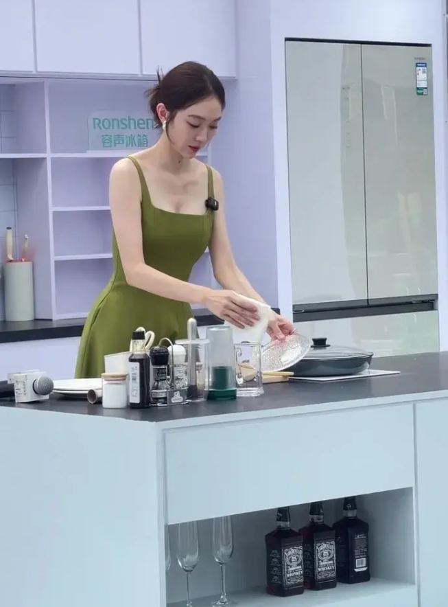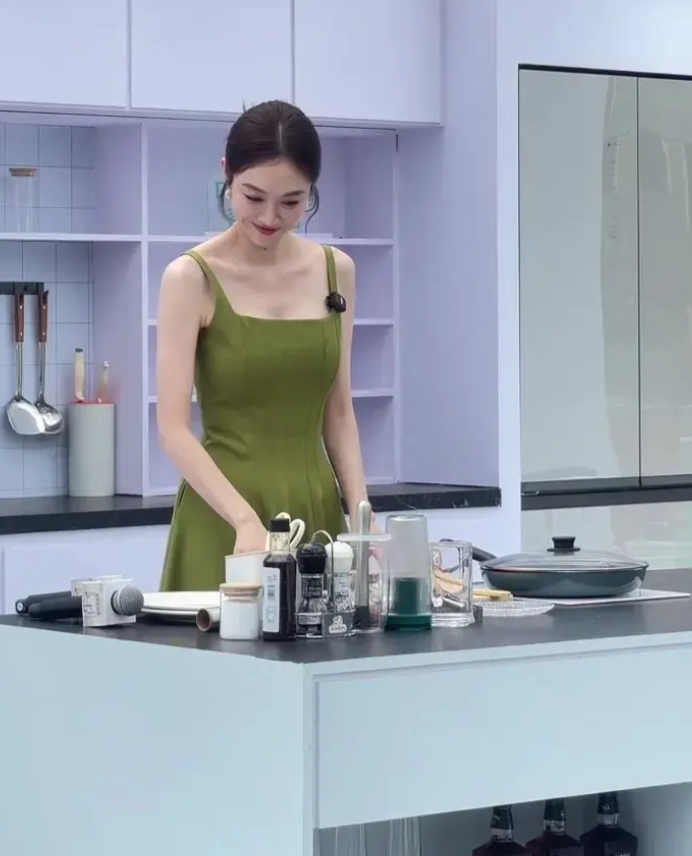 整个造型中,姜妍的装扮既符合厨房环境的实用需求,又不失时尚与美观。