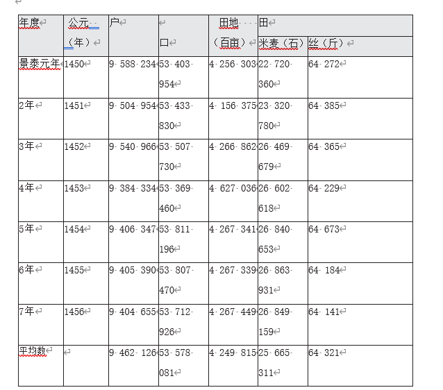 下面我们就以梁先生提供的数据来比较景帝景泰元年到七年,及英宗复辟后的天顺元年到七年这两个时间段的 户、口、田地和米麦与丝的出产(见表 1、表 2)13。