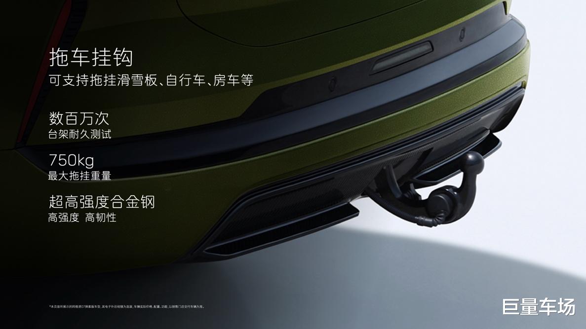 阿维塔07探索版标配的探索套装,包含运动套件、行李箱金属装饰件、车门护板AVATR LED字标、LED前照灯行李架、拖车挂钩。其中,LED前照灯行李架,采用双层镂空结构与U型力学设计,可承重达75kg,既满足露营装备、自行车的固定需求,又能通过支持长按双闪联动的内置LED灯带,实现夜间高辨识度与氛围营造,将实用性与视觉张力融为一体。为了让用户畅享户外美好,超高强度合金钢拖车钩,叠加远超普通防撞梁的拖车横梁强度,达到后碰工况下保护性更强,最大拖拽量达750kg,可支持拖挂滑雪板、自行车、房车等户外大件。而通过十三芯插头与拖挂附件连接,灯光逻辑可跟随牵引车灯光,完美实现拖挂设备与整车智能协同,以及从单一机械性能向系统化安全的跨越,满足用户对探索无限的全面需求。