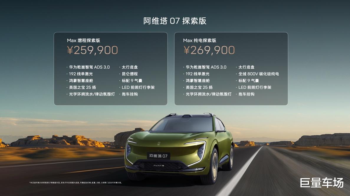 2025年4月12日(重庆),阿维塔科技宣布,阿维塔07探索版正式上市,推出Max增程探索版、Max纯电探索版2个配置版本,全国建议零售价25.99万元~26.99万元。新车标配探索套装和21英寸气璇轮毂,为享受悦己精致设计、热爱探索城市出行与奔赴远方双重需求的用户量身定制,开启“智美豪华 探索无限”出行新纪元!