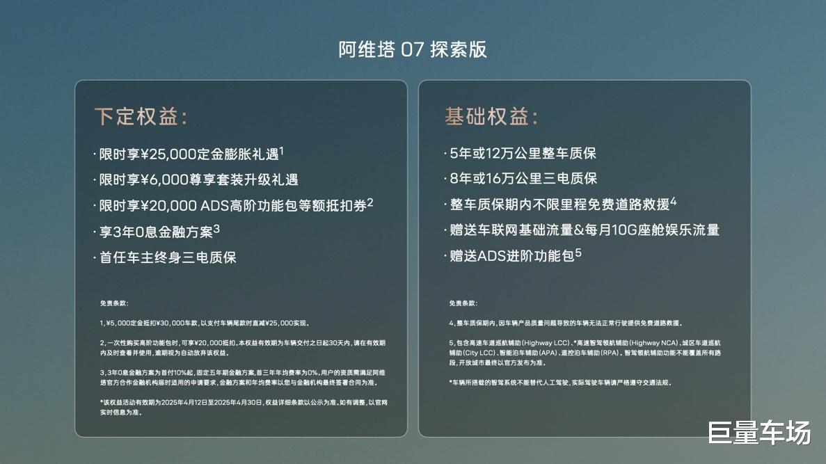 即日起至2025年4月30日,下定用户可限时享25,000元定金膨胀礼遇,阿维塔07探索版权益后价格低至23.49万元~24.49万元;在此基础上,用户还可限时享6,000元尊享套装升级礼遇、20,000元ADS高阶功能包等额抵扣券、3年0息金融方案、首任车主终身三电质保,共5大下定权益。叠加5年或12万公里整车质保、8年或16万公里三电质保等基础权益,多重礼遇开启高品质出行体验。