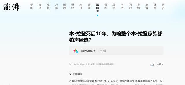 澎湃新闻:《本·拉登死后10年,为啥整个本·拉登家族都销声匿迹?》