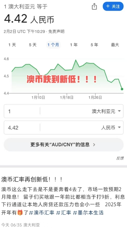 对此在澳华人狂喜表示,这么跌下去是要奔着4去了,且目前市场普遍预测2月降息,在澳华人买什么都相当于9折!房贷压力也会小!