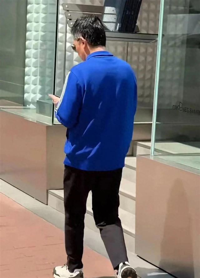 那天,他穿着一件灰色运动外套,搭配一条黑色运动裤,脚踩一双白色运动鞋,整体造型简单而舒适。