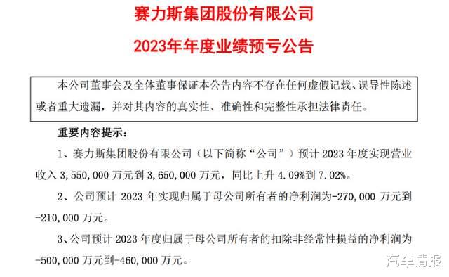 不过,伴随销量数据而来的还有近期赛力斯(601127.SH)发布的2023年年度业绩预亏公告,预计2023年归母净利润为亏损21亿-27亿元。一边是销量端逆袭理想,另一边却是利润持续亏损,数字间充满魔幻。