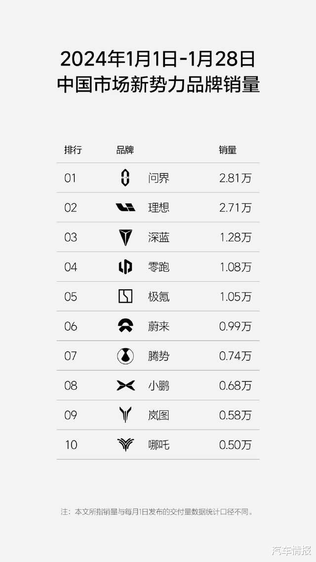 如果不出什么意外的话,1月份的中国市场新势力销量第一名就要变成AITO问界了。这不得不让人感叹华为的号召力,原本表现很糟糕的问界M7居然在大改款之后“起死回生”,让始终被理想吊打的AITO问界出了一口气。