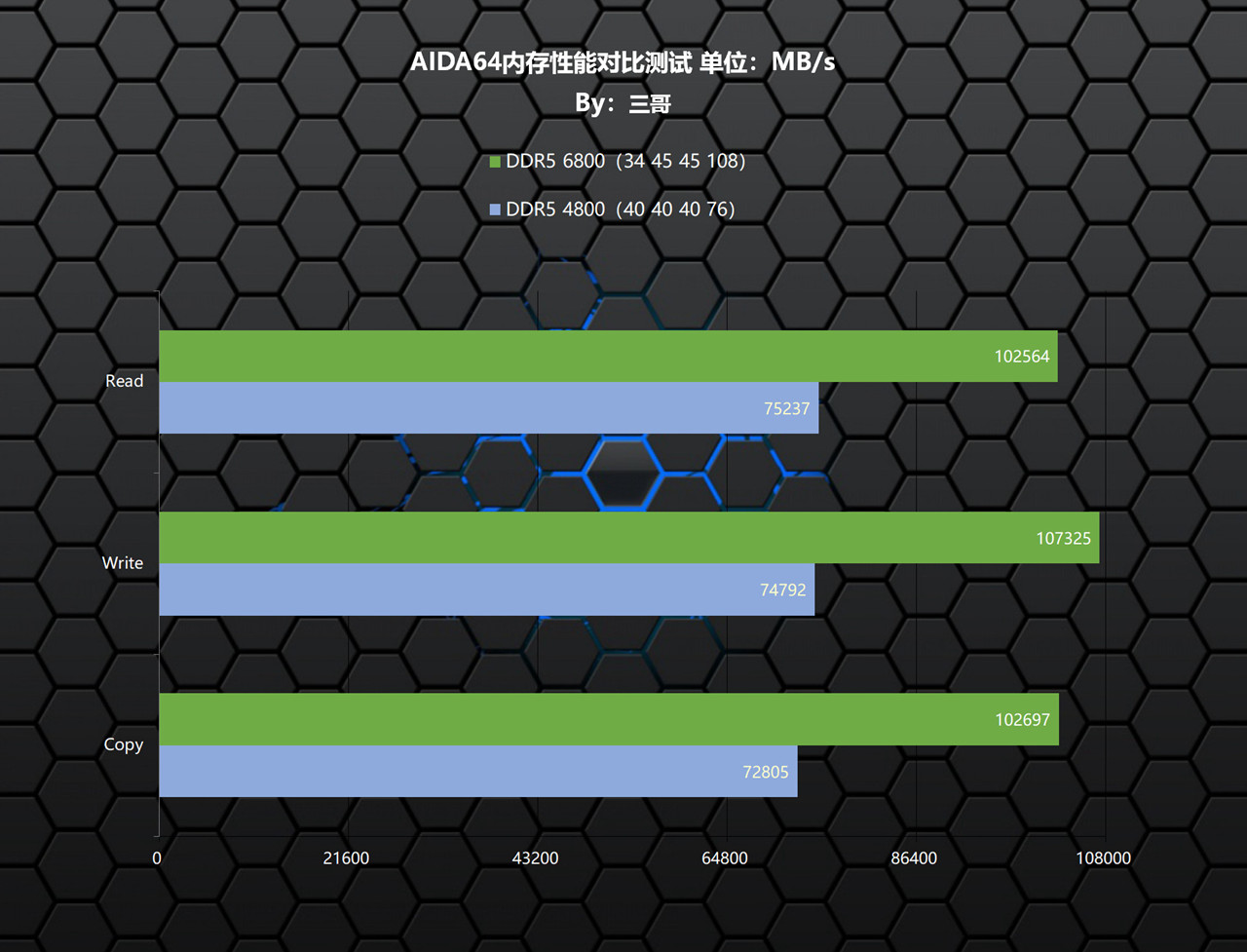 汇总一下,可以看出,超频后的内存读、写、复制性能再次得到了大幅度领先。