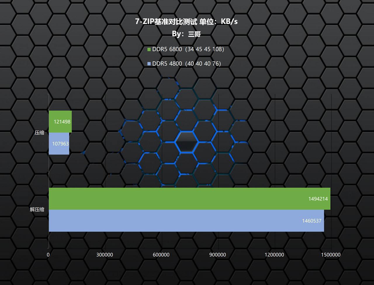 在该测试中,开启XMP相较默频,压缩性能和解压性能均有不小的领先。