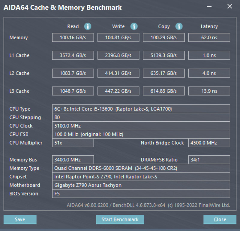 也能顺利通过AIDA64内存测试,此时内存的写入速度超过了120GB/s大关,读取和复制速度也都超过了115GB/s大关。