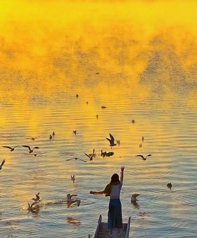 上午:跟海鸥在泸沽湖的晨雾中合影,感受到了现实版的“舟行碧波上,人在画中游”