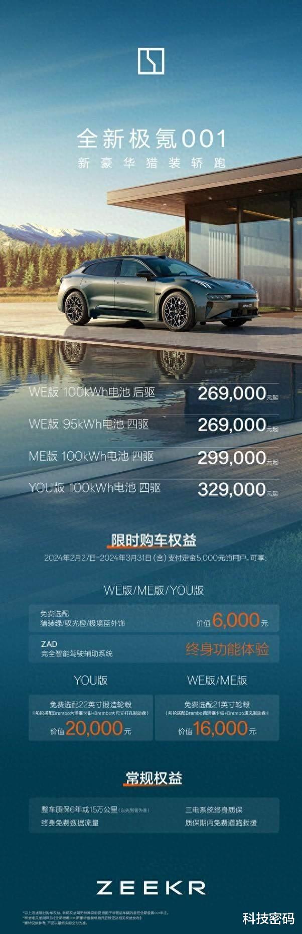 限时预定权益:从2024年2月27日至2024年3月31日,所有支付5,000元定金的用户,均可免费选配价值6,000元的猎装绿、驭光橙、极境蓝外饰色;所有WE版、ME版大定用户,均可免费选配价值16,000元的21英寸轮毂,前轮搭配Brembo四活塞卡钳、Brembo通风制动盘;所有YOU版大定用户,都可以免费选配价值20,000元的22英寸锻造轮毂,前轮搭配Brembo六活塞卡钳、Brembo打孔制动盘。另外,所有极氪001历史版型车主和3月31日(含)前购买全新极氪001的用户,均可免费获得价值35,000元的ZAD完全智能驾驶辅助系统终身功能体验。