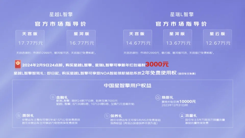 日前,吉利星瑞L智擎推出星云版、星河版和天宫版三个版型,官方指导价为12.67万元—14.67万元;而吉利星越L智擎推出星河版和天宫版两个版本,官方指导价为16.77万元—17.77万元。