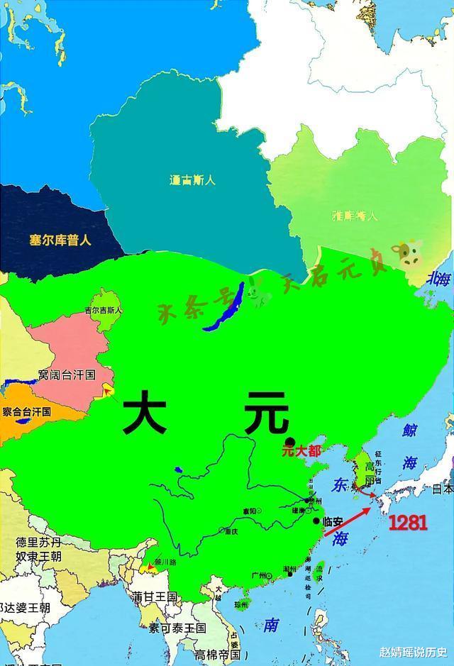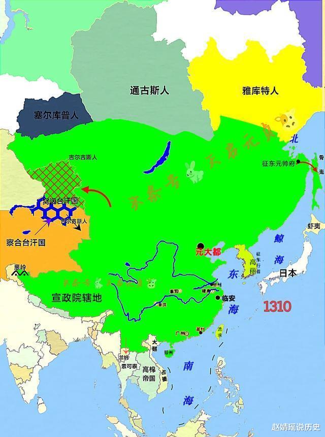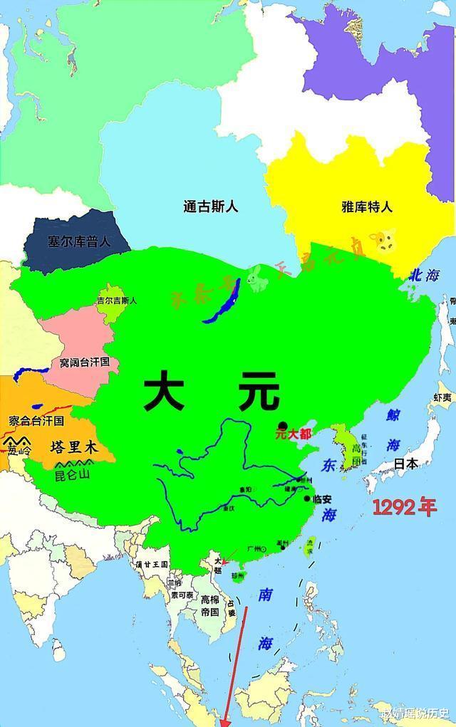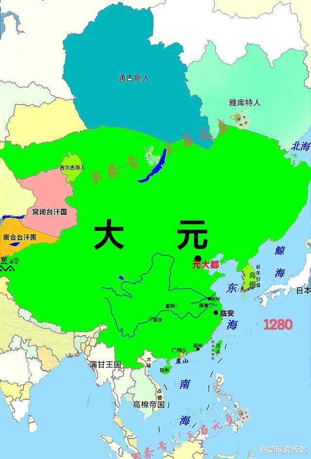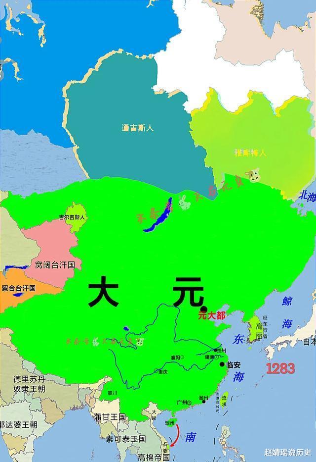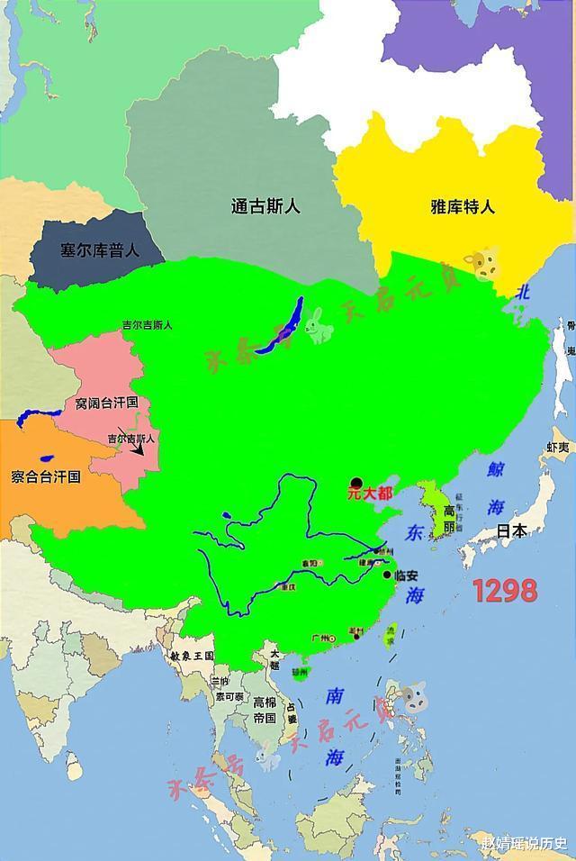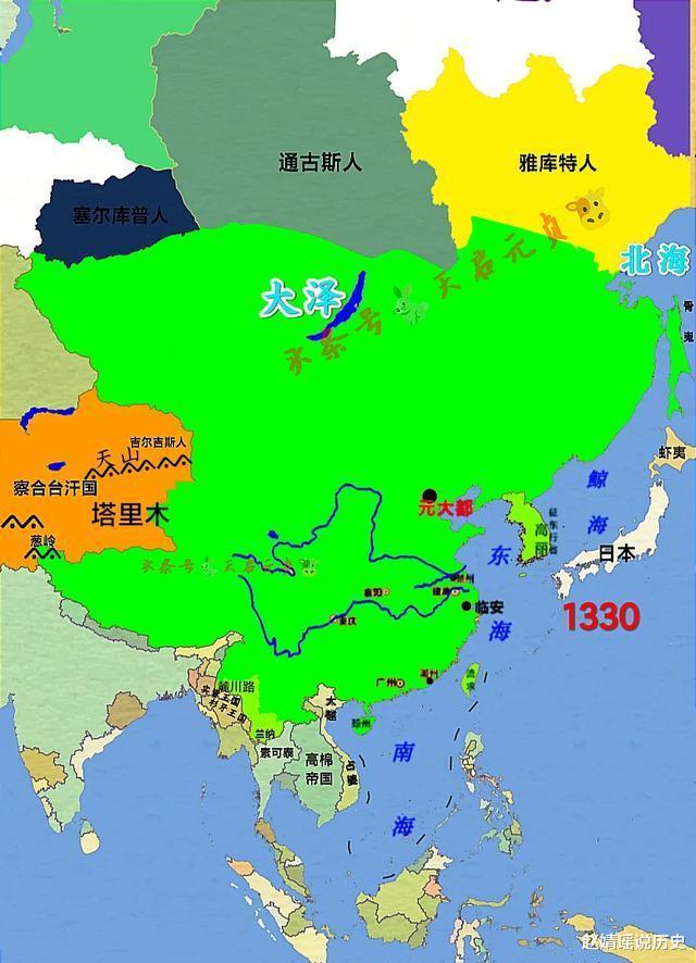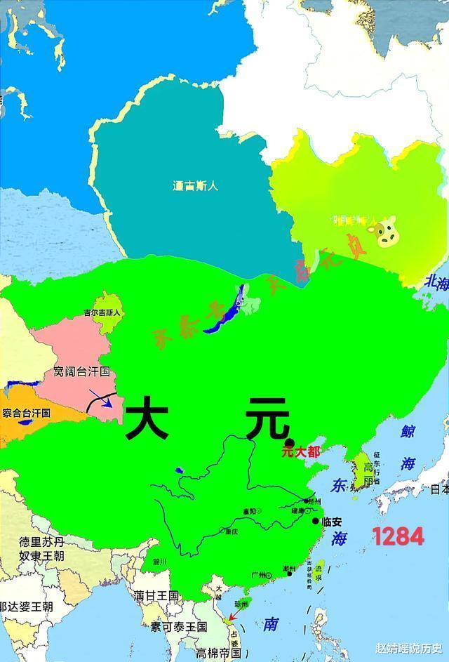元朝版图至此达极盛,西界天山,东至鲸海,北越贝加尔湖,南抵南海,总面积逾1400万平方公里,乃中国历朝之最。
