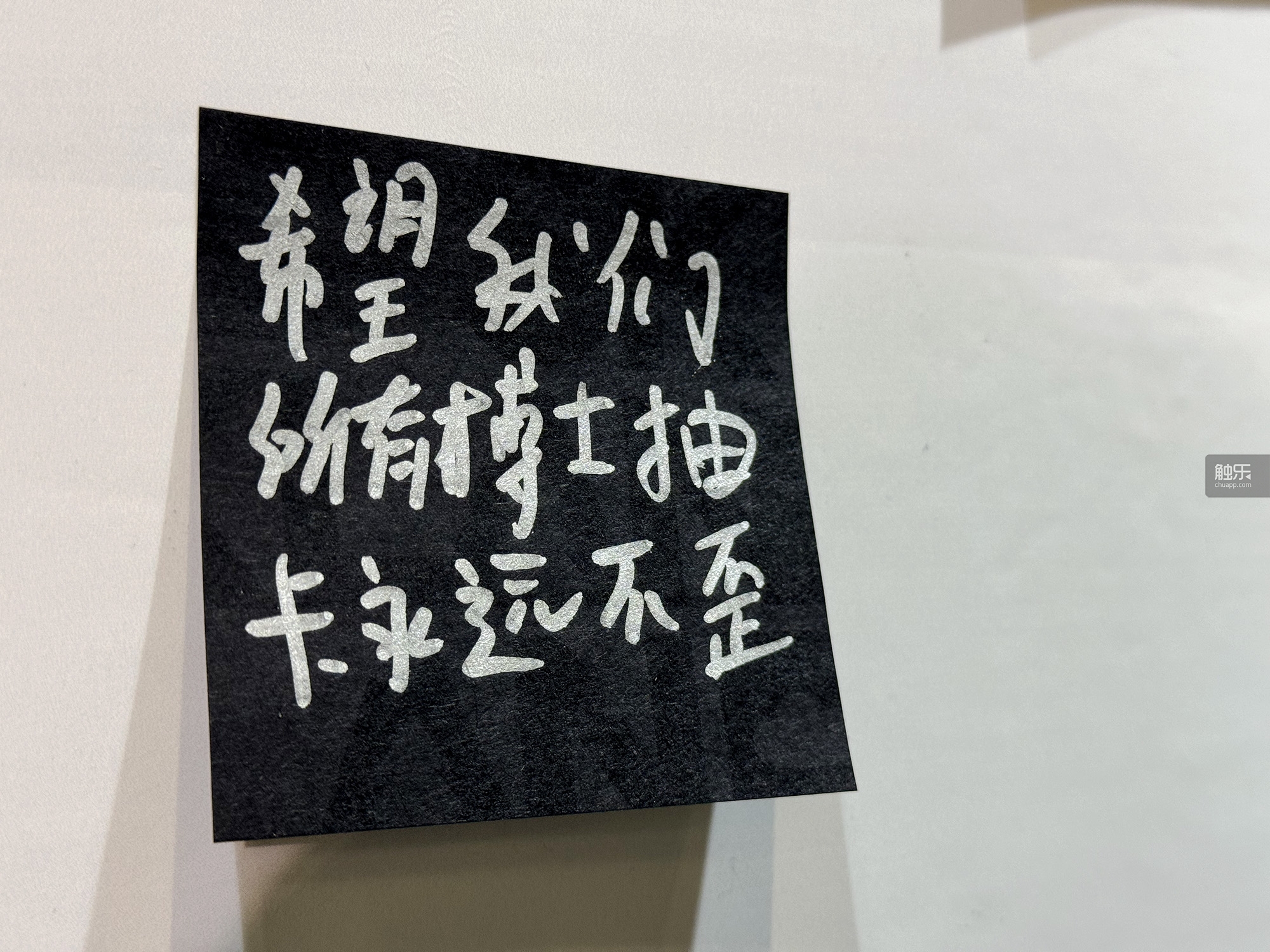 在这次嘉年华的衍生馆中,有一个区域,放置的是许多画师为《明日方舟》五周年绘制的贺图。入口处,有一段游戏制作人“海猫络合物”写下的话,让我印象深刻的是最后一段:“我现在有个愿望,希望我能够让它(《明日方舟》)一直带给大家快乐、理想和希望。”